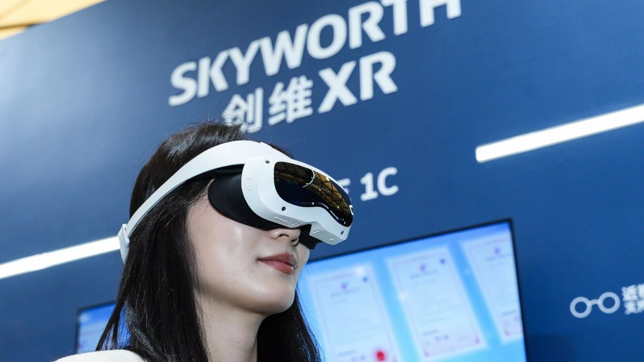 同样首次参展的还有创维XR,共展出两款产品PANCAKE 1C VR一体机和AR眼镜 。其中,PANCAKE 1C VR一体机,此机型为全球首款消费级短焦VR一体机,具有超薄机身,整机重量436g(主机重量189g),机身厚32mm,佩戴舒适度大为升级;同时自研的6DOF追踪定位+高通骁龙XR2的顶级配置,使得主流VR经典大作都能提供丝滑流畅的运行体验。在VR领域,创维聚焦硬件与内容双轮驱动,产品在重量、分辨率、结构、便捷度、舒适度等多款指标上取得突破,并开创了3D 180度VR才艺互动直播,开启直播新时代。一同展出的创维AR眼镜,重量仅69g,虚拟成像6m173寸,视场角40°,可以连接手机进行观影,还可以连接游戏机如Switch进行玩游戏,以及在B端商业应用领域进行办公等。