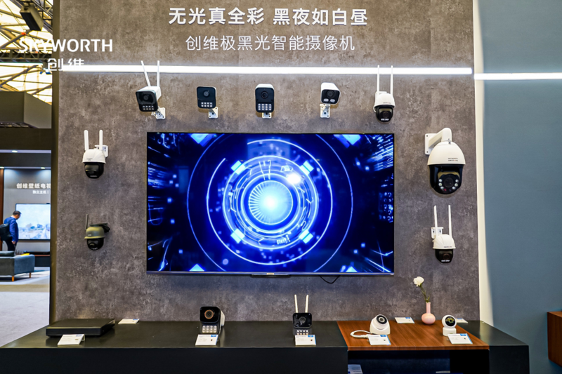 在安防方面,创维带来行业首创的极黑光摄像头,最大亮点在于其搭载“湃影”智慧影像处理系统,自带2T澎湃算力,可实现全天候的真彩画面输出,即使在无光环境中,依然能输出彩色画面。经过20年坚持不懈地在AI人工智能、云平台及智能制造等多个领域投入和耕耘,创维安防的产品布局已覆盖家庭智能安防、商用智能安防等多个细分领域。