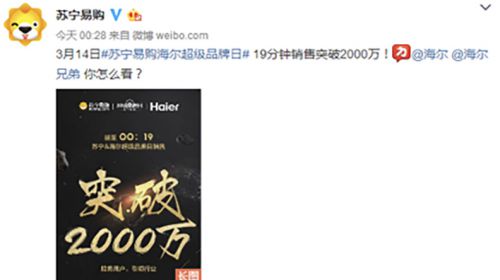 3月14日零点刚过,苏宁海尔超级品牌日正式启动。仅仅19分钟后,销售即突破2000万,全品类销售突破8000台,创造了超品日全品类品牌销量第一的傲人战绩。...