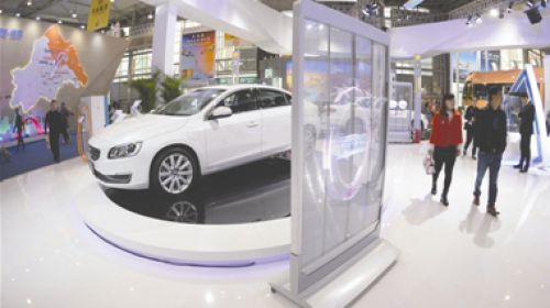 成都,西博会成都展区,“成都造”沃尔沃S60L智能E驱插电式混合动力车在这里展出。目前,新能源汽车是成都市突出发展的主导产业 新能源汽车全产业链...